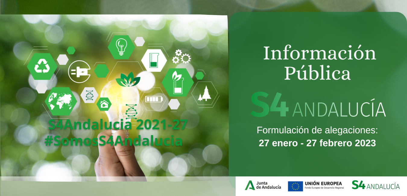 La Consejería de Universidad, Investigación e Innovación ha abierto el plazo de información pública para la propuesta de Estrategia de Especialización Inteligente para la Sostenibilidad de Andalucía 2021-2027 (S4 Andalucía), tal y como recoge el BOJA de 27 de enero. Este instrumento que será aprobado por el Consejo de Gobierno de la Junta, recoge la planificación de la política del Gobierno andaluz en materia de innovación para este septenio y su adopción es necesaria y preceptiva para que la Comunidad Autónoma andaluza pueda recibir financiación en el actual marco comunitario de Cohesión en el ámbito de I+D+I.